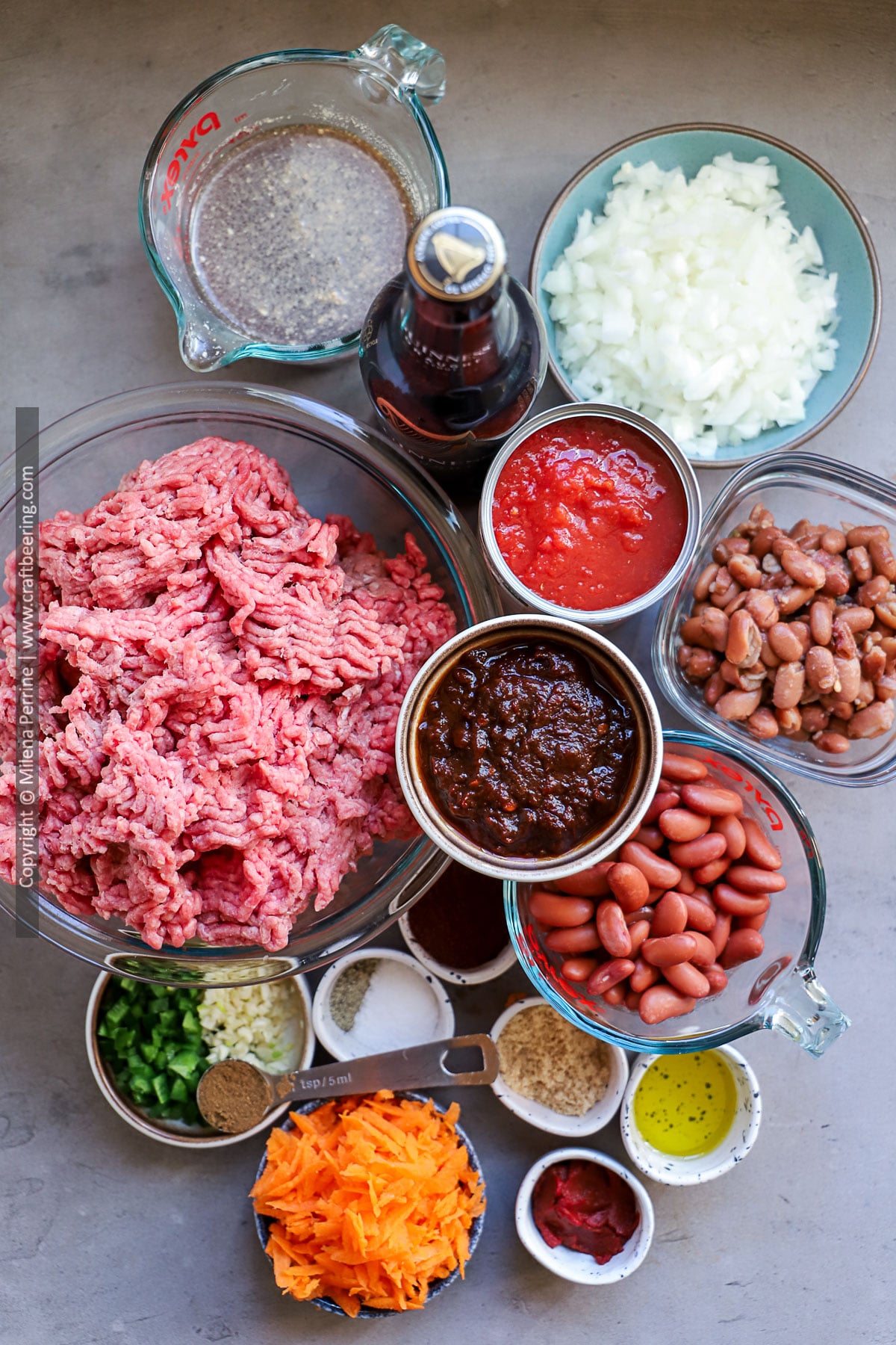Then transfer the aromatics to a pre-heated slow cooker, add in the ground beef, follow with the beer and stir; add the flavorings, beans, tomatoes and beef stock and stir again. Cook on the low setting for about 6 hours (or until beef is really tender) or on the high setting for about 3 hours (or until the beef is tender).