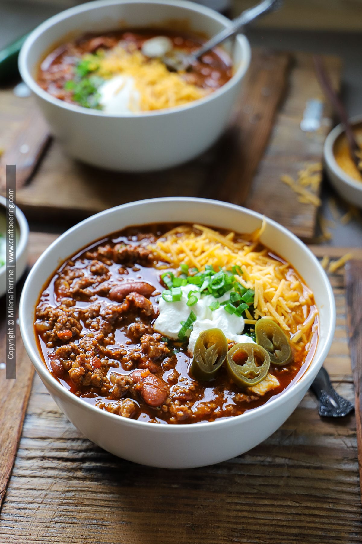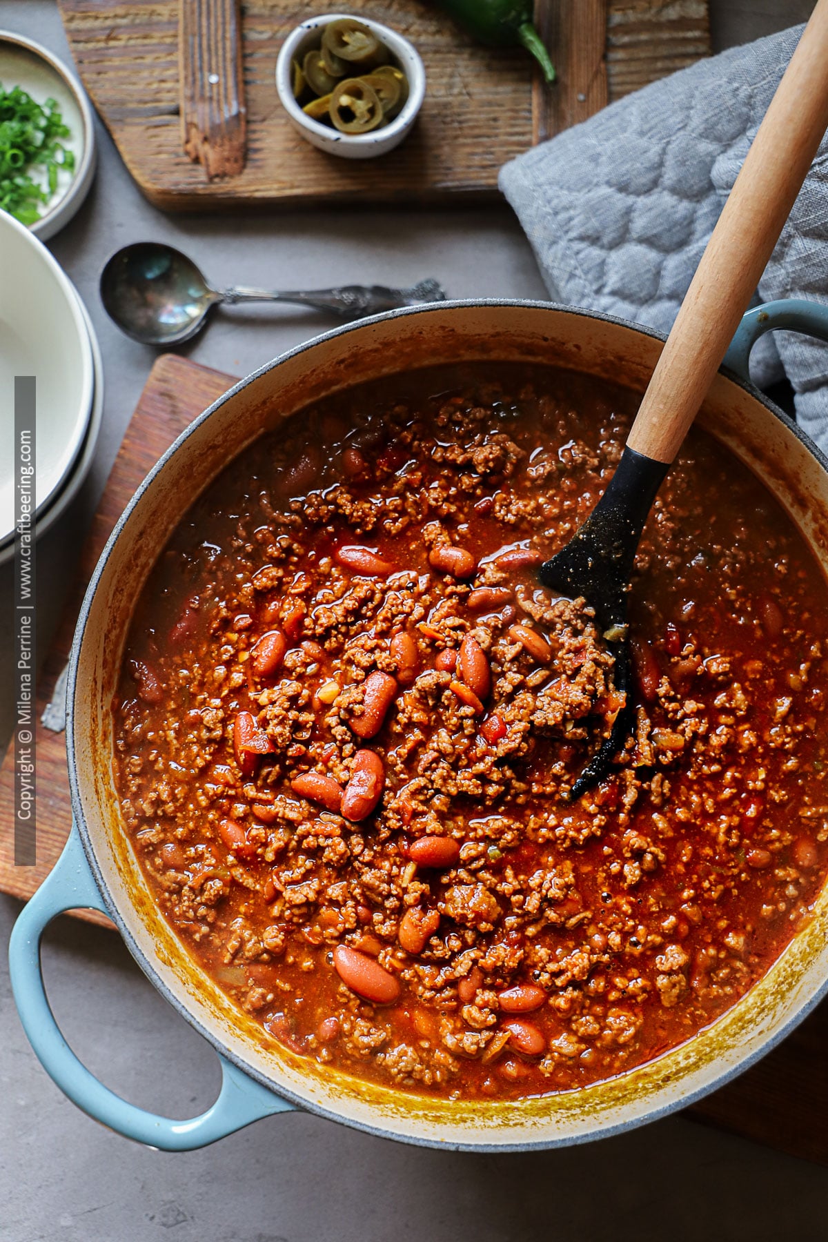 - When the ground beef has become tender to your satisfaction, turn off the heat and allow the chili to sit for a couple of minutes uncovered. Taste and season as needed. Serve with sour cream, thinly sliced green onions, shredded cheddar and pickled jalapeno slices.