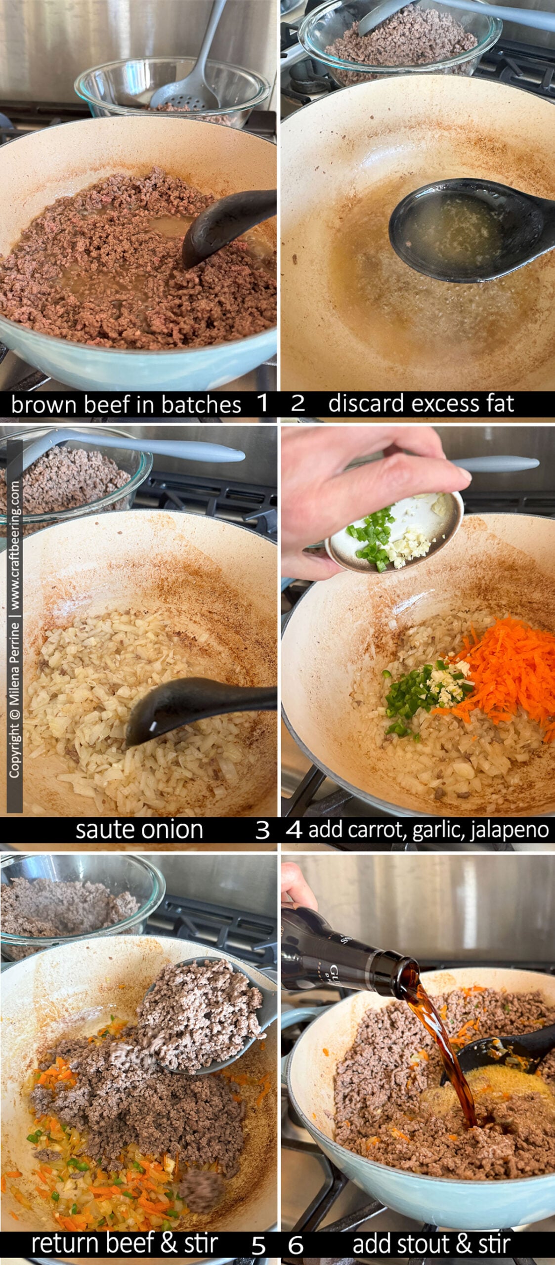 - Saute the aromatics, add back the beef and follow with the stout. Begin with the onion first, cook it until translucent and then add the grated carrot, diced jalapeño and minced garlic and saute for another minute or so. Instead of deglazing with the beer first, add back the browned ground beef, stir and then add the beer. There will be enough time for the alcohol to cook off as the chili simmers yet most of the flavors of the dark ale will imbibe the beef right away.