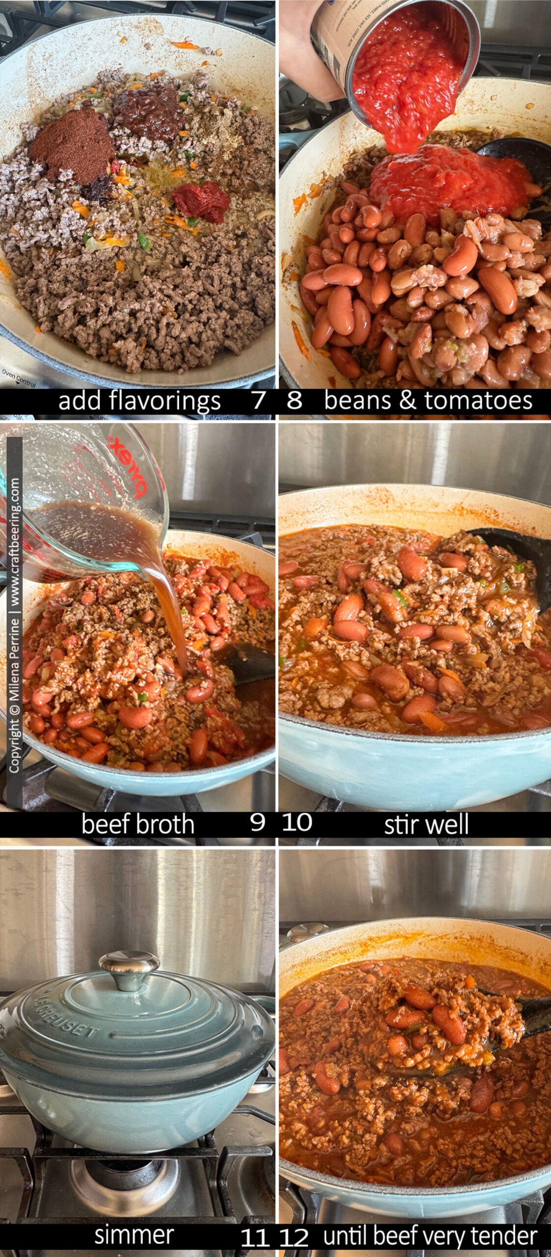 - Finish assembling and simmer. Add the crushed tomatoes, the rinsed and drained pinto and kidney beans and finally the beef broth. Stir well and bring to a gentle boil. Reduce the heat to low, cover and let simmer for about an hour. Periodically stir. Taste check for tenderness and seasonings adjustments at that time.