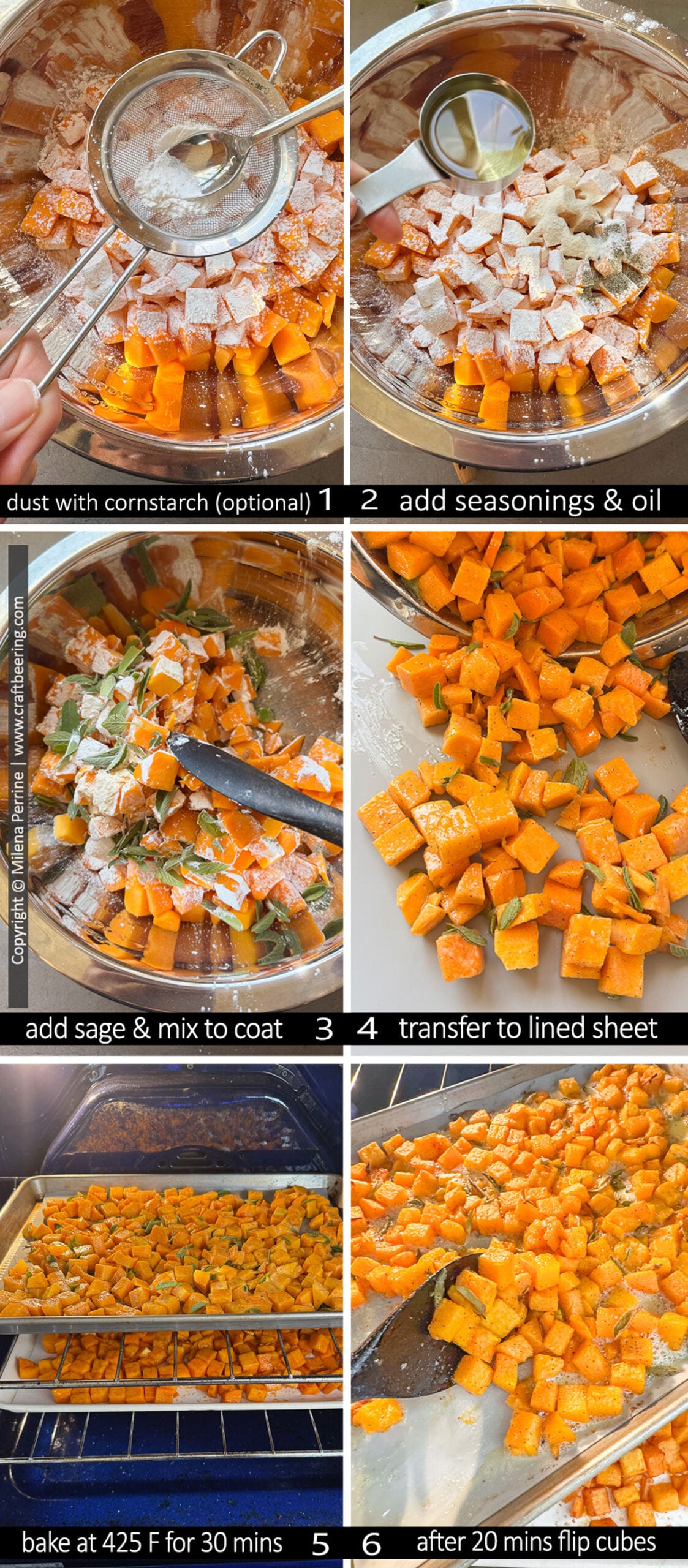Prep. Pre-heat oven to 425 F and line a baking sheet with parchment paper or silicone pad. Place the butternut squash cubes in a large bowl, dust with corn starch if using, add oil and seasonings and mix to coat well.
