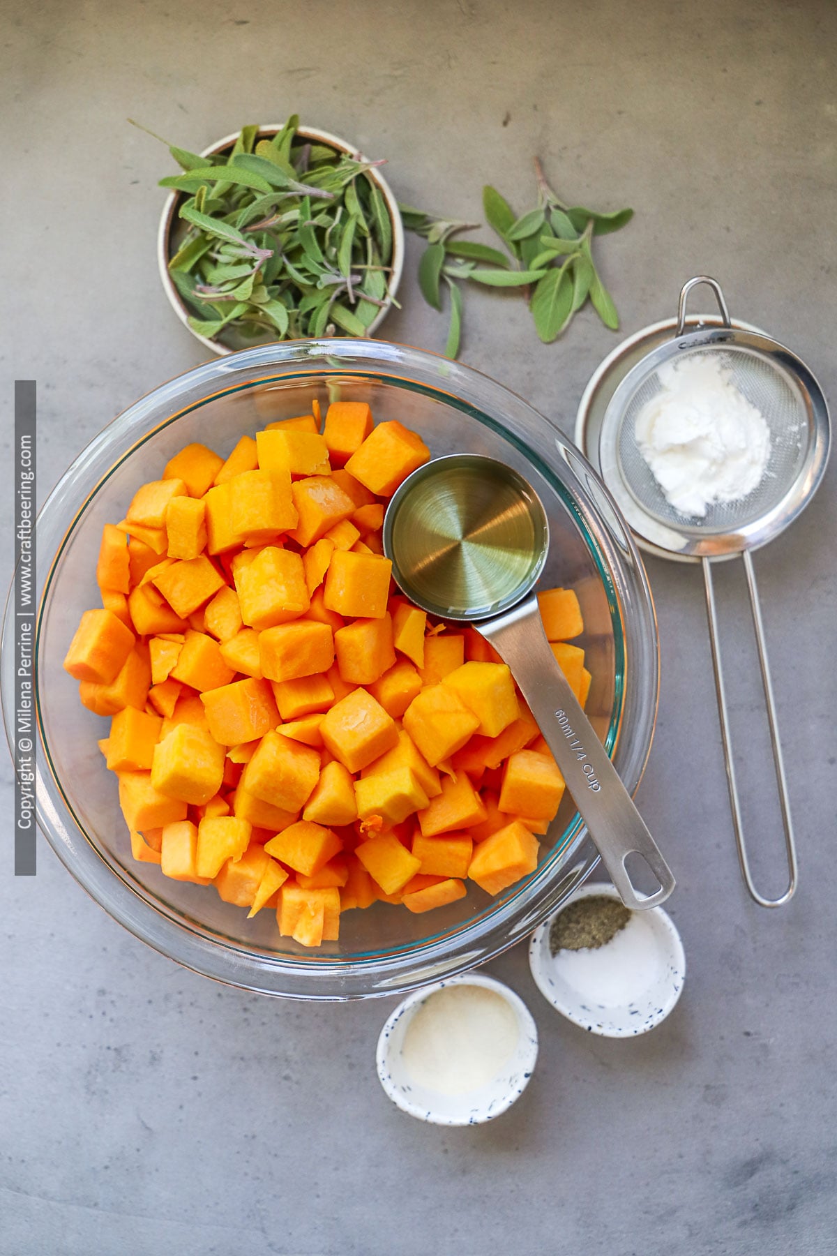 Below we show you the ingredients for two versions of roasted butternut squash. The first one, with sage, can be considered a classic fall and winter side dish, it is suitable for a variety of pork dishes, beef roasts, lamb roasts, turkey, chicken and other poultry. You can also fold it in kale salads or rice bowls and pilafs.