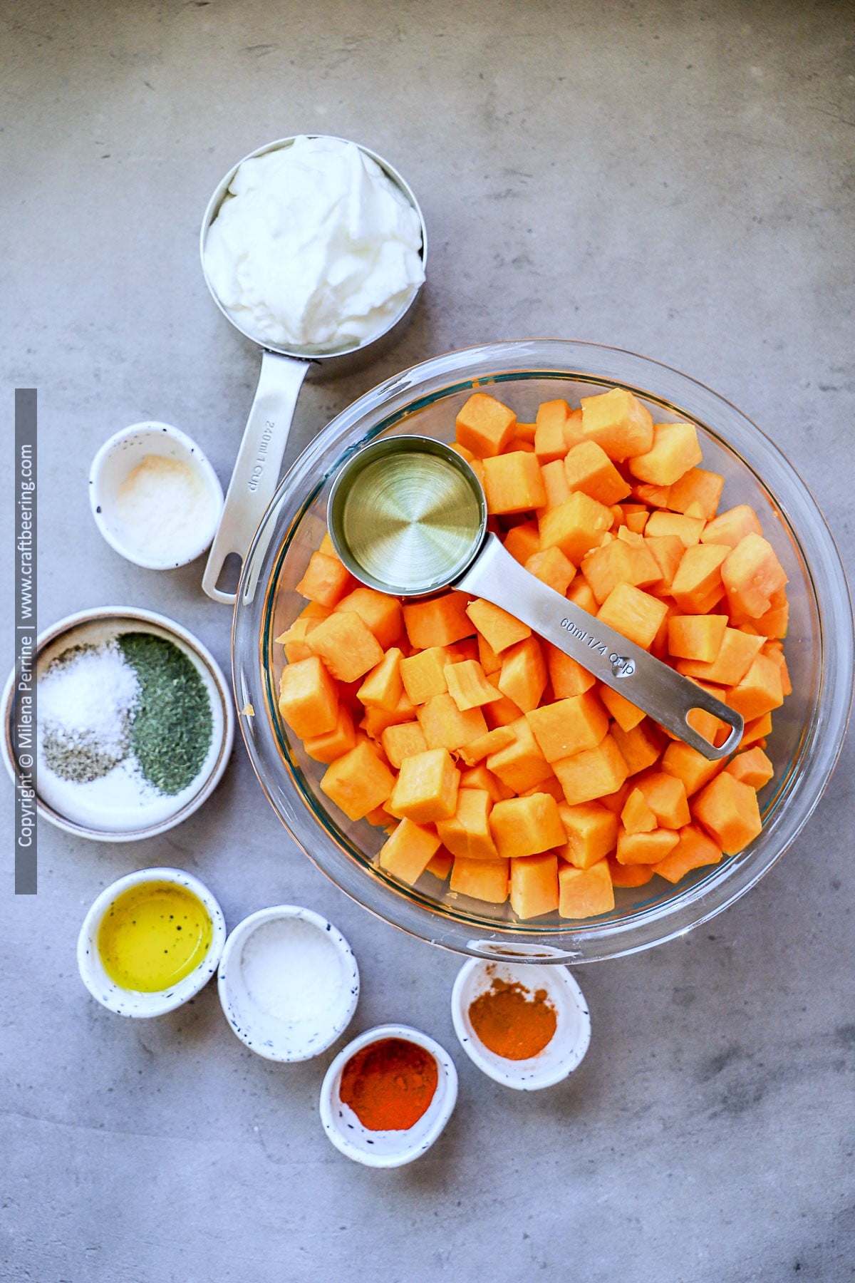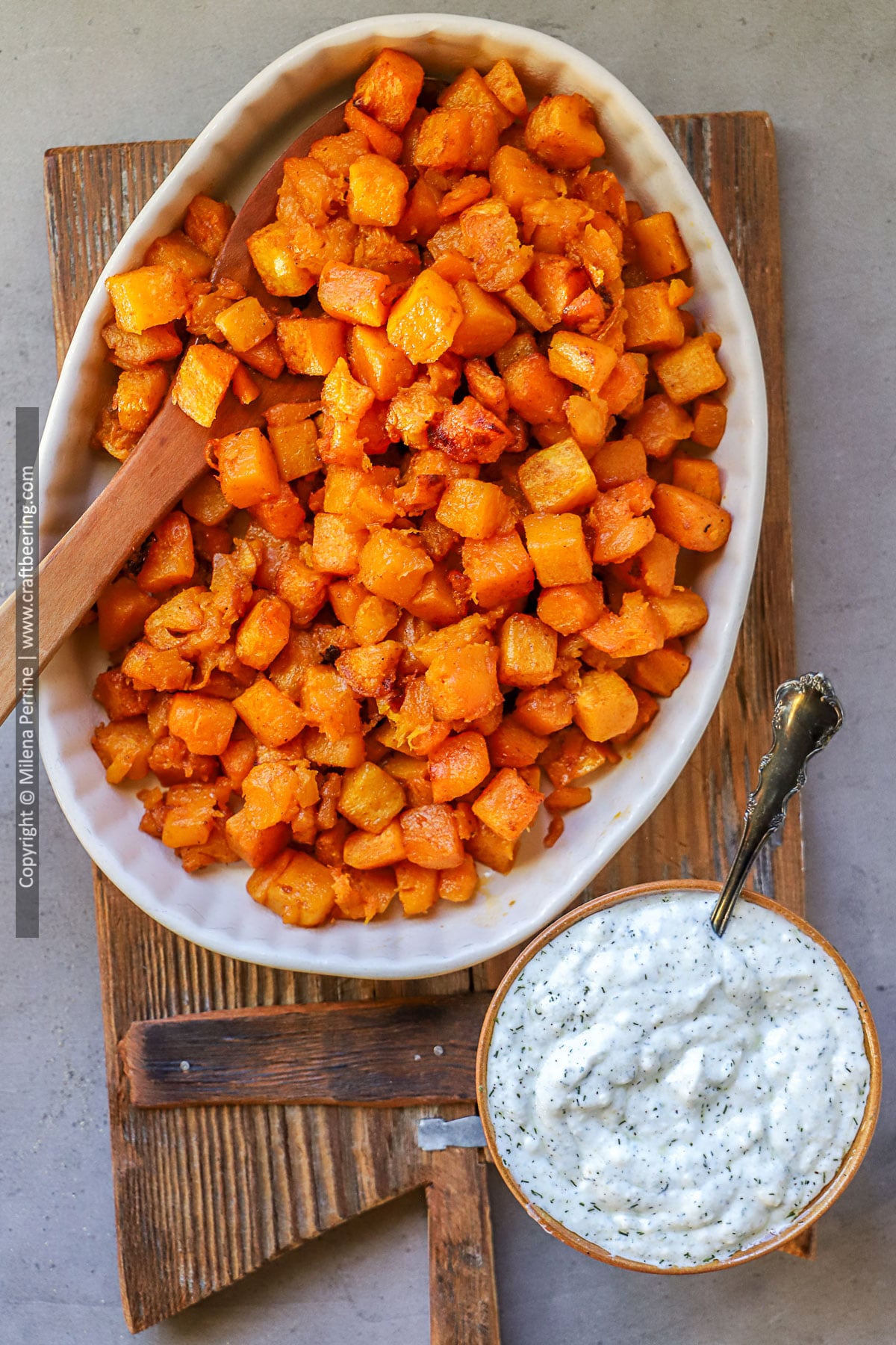 Yogurt sauce. This simple mixture of natural yogurt, olive oil, dried dill, garlic powder, salt and pepper becomes a delicious sauce that provides a cooling down effect for the heat of the cayenne flavoring the roasted butternut squash. Exact quantities in the Recipe Card below.